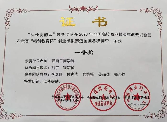 近三年来,工商管理专业学生参加教育部各类学科竞赛上,共获国家级及省级奖项20余项。其中较高奖项有:2023年全国高校商业精英挑战赛创新创业竞赛全国一等奖、2023年全国大学生创新创业大赛省级金奖、2023年全国高校商业精英挑战赛品牌策划大赛全国三等奖、第十一届全国大学生“创新、创意及创业”挑战赛省赛二等奖、第十届正大杯全国大学生市场调查与分析大赛省赛二等奖等。