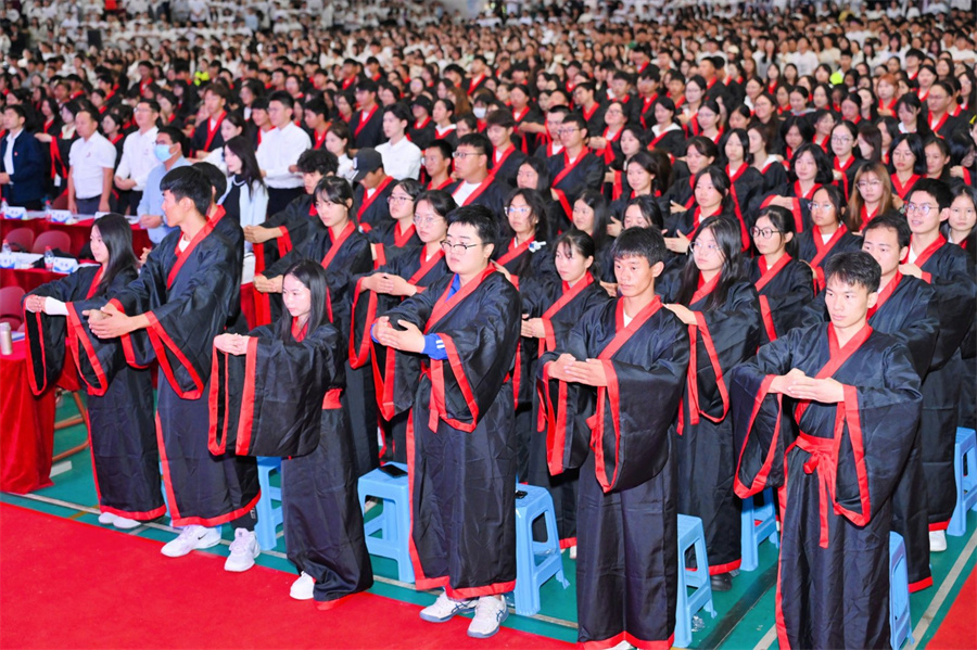 入学尊师礼在融合传统文化与现代教育的仪式中正式举行,学子们正衣冠,向孔子像敬献花篮,一拜自强不息,二拜厚德载物,三拜精忠报国,四拜孝亲尊师,五拜至亲父母。