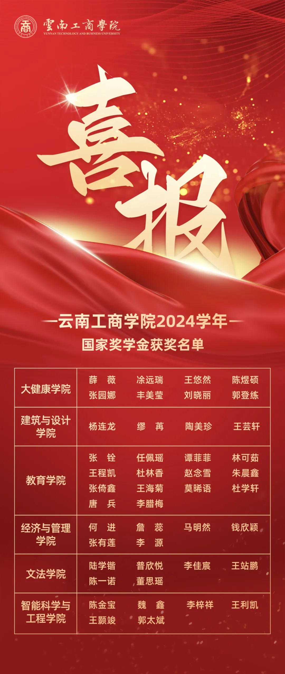 近日,2023—2024学年国家奖学金名单已完成公示。云南工商学院44名学子荣获国家奖学金,每位学子荣获10000元奖学金奖励。特向获奖同学们表示热烈祝贺!