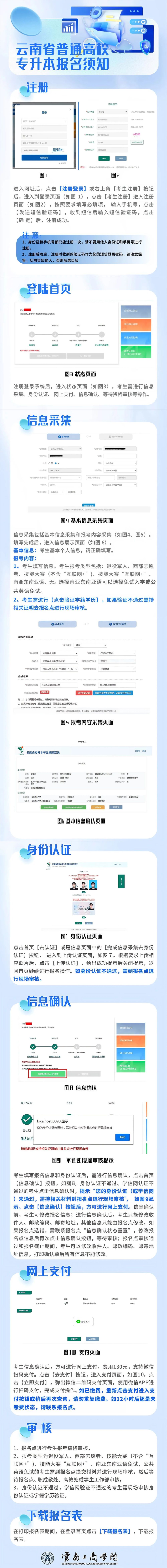 考生登录“云南省招考频道”(www.ynzs.cn),点击“云南省专升本考生管理系统”进行网上报名、网上缴费。
